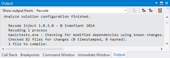 If you have edited files within Visual Studio, Recode will save them, analyze the solution, compile modified files, link them into a patch file and finally inject the patch into the debugged process. The Recode output window displays progress and any warnings or errors: